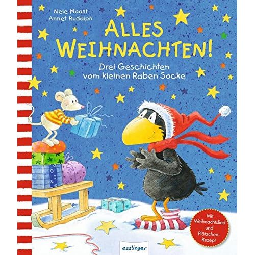 Buchrückseite Der kleine Rabe Socke erlebt einen tollen Nikolaus-Tag, mit vielen Schuhen und noch mehr Süßigkeiten. Dann wird er mal eben Weihnachtsmann und findet heraus, dass Schenken das Allerbeste ist. Und zum Schluss feiert er mit seinen Freunden Weihnachten. Aber bei der ganzen Vorbereitung hat der kleine Rabe doch glatt vergessen, seinen Wunschzettel abzuschicken. Ob er wohl trotzdem ein Weihnachtsgeschenk bekommt? Drei rabenstarke Weihnachtsgeschichten in einem dicken Band. Über den Autor und weitere Mitwirkende Nele Moost wurde 1952 in Berlin geboren und verbrachte einen Teil ihrer Kindheit in Schweden. Nach einem Studium der Germanistik arbeitete sie als Lektorin in einem Kinderbuchverlag. Heute schreibt sie Geschichten für Kinder und Erwachsene, die in über 30 Sprachen übersetzt wurden. Für den Esslinger Verlag hat Nele Moost die Figur und die Geschichten vom frechen kleinen Raben Socke erfunden, die von der Illustratorin Annet Rudolph bildlich umgesetzt werden. Der kleine Rabe ist zu einer Lieblingsfigur geworden und Nele Moost hat immer großen Spaß, neue Abenteuer von Socke und seinen Freunde zu erzählen.Gebundene Ausgabe=48 Seiten. Verlag=Esslinger Verlag in der Thienemann-Esslinger Verlag GmbH (5. Oktober 2017). Sprache=Deutsch. ISBN-10=3480233864. ISBN-13=978-3480233861. Vom Hersteller empfohlenes Alter=36 Monate - 6 Jahre. Originaltitel=820192 und 821830 und 823143. Größe und/oder Gewicht=22,2 x 1,7 x 26,1 cm. Durchschnittliche Kundenbewertung=5.0 von 5 Sternen 5 Kundenrezensionen. Amazon Bestseller-RangWeihnachten=Nr. 152.871 in Bücher (Siehe Top 100 in Bücher) .zg_hrsr { margin: 0; padding: 0; list-style-type: none; } .zg_hrsr_item { margin: 0 0 0 10px; } .zg_hrsr_rank { display: inline-block; width: 80px; text-align: right; } Nr. 201 in Bücher > Kinderbücher > Feiertage & Feste >.